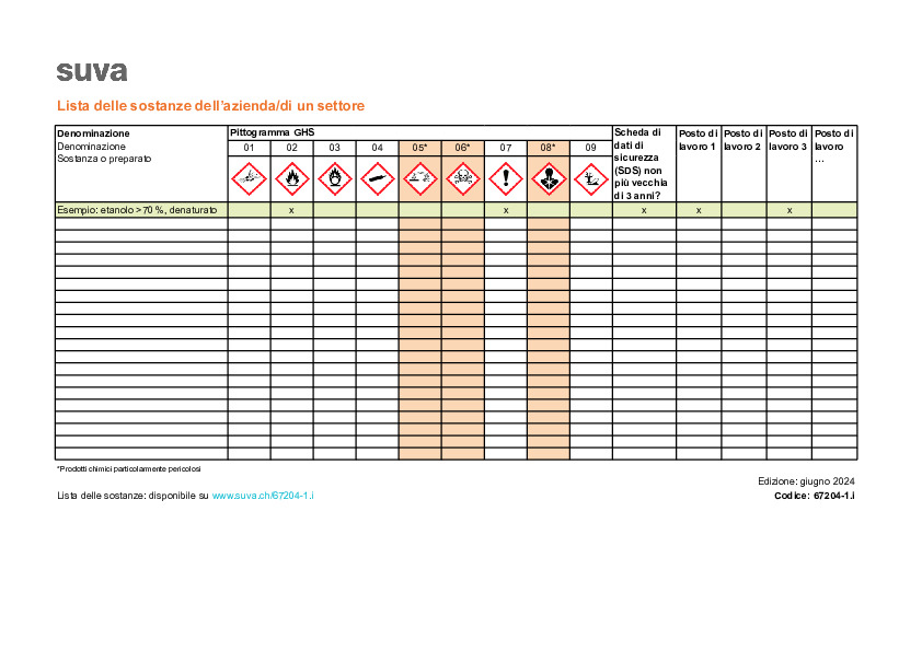 Molte aziende utilizzano sostanze nocive. Dette sostanze vengono impiegate nelle aziende per svolgere diverse attività e, in caso di manipolazione impropria, possono provocare malattie professionali che spesso comportano danni irreversibili e costi elevati. È quindi molto importante che abbiate una visione d’insieme delle sostanze e dei preparati utilizzati in azienda e che, tra questi, identifichiate i prodotti chimici particolarmente pericolosi, al fine di adottare misure mirate ed efficaci che ne garantiscano una manipolazione sicura. Nella lista di controllo sono trattate le seguenti tematiche: Scaricate la lista di controllo e garantite una maggiore sicurezza nella manipolazione delle sostanze nocive. Come complemento, raccomandiamo anche il nostro opuscolo Sostanze pericolose. Tutto quello che è necessario sapere. Maggiori informazioni al riguardo sono disponibili alle pagine www.suva.ch/cmr e www.suva.ch/sostituzione.