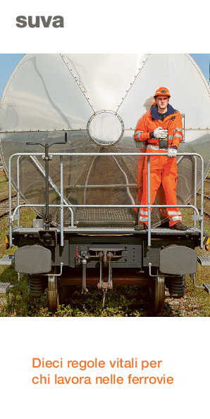 Determinate attività nel settore ferroviario possono essere molto pericolose. Per esempio spesso gli interventi nella zona dei binari devono essere svolti durante la circolazione dei treni. Molti lavori sono eseguiti vicino alle linee dell'alta tensione. Ma anche il personale che assiste la clientela a bordo è talvolta esposto a situazioni difficili, per esempio può essere aggredito. In media, ogni anno si infortunano tre o quattro persone in questo settore. Regole di sicurezza specifiche nel trasporto ferroviario possono aumentare la sicurezza. Abbiamo sviluppato dieci regole vitali per chi lavora nelle ferrovie che favoriscono una maggiore sicurezza del personale, se sono rispettate sistematicamente. Istruite il personale con regolarità su queste regole. Garantirete così una maggiore sicurezza. Ordinate un numero sufficiente di pieghevoli con le regole vitali per chi lavora nelle ferrovie e distribuiteli prima della formazione. L'ideale è trattare una regola per volta direttamente sul luogo di lavoro o di intervento. Per la formazione sulle regole per i vostri collaboratori rimandiamo ai nostri video didattici. Ogni regola contiene varie indicazioni di sicurezza per il personale e per le funzioni superiori, specifiche per i rispettivi ruoli.