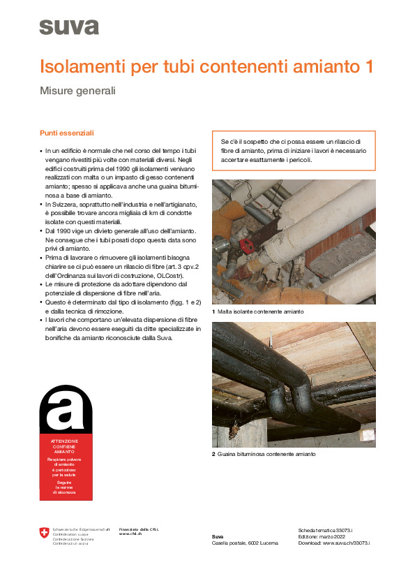 L'amianto compare dal 1990 nell'elenco dei materiali per l'edilizia vietati. La rimozione di questo materiale così pericoloso non è però ancora un capitolo chiuso. Si stima infatti che migliaia di chilometri di tubazioni isolate con materiali contenenti amianto siano ancora presenti in vecchi immobili residenziali e soprattutto in edifici commerciali e industriali. Nel caso di lavori di ristrutturazione in costruzioni erette prima dell'entrata in vigore del divieto: A seconda del tipo di rivestimento è richiesto un diverso metodo di rimozione. Nella scheda tematica trovate uno schema che illustra come individuare la procedura corretta. Se la rimozione di malta o di impasto di gesso contenenti amianto comporta un rischio elevato di disperdere fibre di amianto nell'aria, non potete svolgere il lavoro in autonomia. In questo caso dovete incaricare una ditta riconosciuta specializzata in bonifiche da amianto. In queste schede tematiche descriviamo due procedure: Scheda tematica 2: Smontaggio con tecnica non distruttiva, rimozione di guaine bituminose