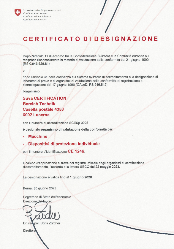 Suva CERTIFICATION è il vostro organismo di valutazione della conformità per macchine e dispostivi di protezione individuale. Il certificato di designazione della SECO lo attesta. L'Unione Europea riconosce Suva CERTIFICATION come organismo notificato di valutazione della conformità (Notified Body, numero di identificazione 1246). Nel certificato di designazione sono indicati, oltre alle basi legali, anche il numero di accreditamento, il numero di identificazione e il periodo di validità di questo certificato. Sulla base di ciò, Suva CERTIFICATION è autorizzata a fungere da organismo di valutazione della conformità per le vostre macchine e per i dispositivi di protezione individuale. La Suva vanta una pluriennale esperienza nel campo della certificazione di prodotti. Noi verifichiamo e certifichiamo che la vostra macchina o il vostro prodotto soddisfino i requisiti vigenti nel mercato interno europeo. Ulteriori informazioni sul nostro supporto offerto per voi sono disponibili nella pagina Certificazioni di prodotti.