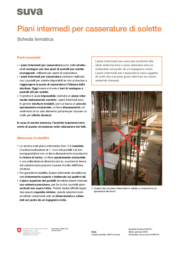 kI piani intermedi per casserature di solette non sono più conformi allo stato della tecnica. A causa del pericolo di cedimento latente, il rischio di infortuni gravi e danni materiali elevati è stato classificato come alto. Così, i piani intermedi per casseratura sono ammessi solo se vengono collaudati sul posto da un ingegnere edile. Ecco i motivi per cui non si dovrebbe utilizzare questa tecnica di casseratura: Conclusione della scheda tematica: sconsigliamo di adottare questa struttura d'appoggio e raccomandiamo l’impiego di sistemi di casseratura moderni, più validi anche dal punto di vista della sicurezza. Tenete presente che dovete ridurre al minimo possibile gli infortuni sin dalla pianificazione dei lavori di costruzione. Se continuate a lavorare con piani intermedi per casseratura precari e il personale subisce lesioni o vengono causati danni materiali, potreste essere soggetti a indagine. E in quanto imprenditori potreste essere tenuti a dare delle spiegazioni. In combinazione con questo argomento vi consigliamo anche le nostre tre schede tematiche Puntelli per solette, Travi per la casseratura di solette e Casseri per solette in strutture con soffitti alti. Qui vi mostriamo come eseguire lavori di casseratura in sicurezza.