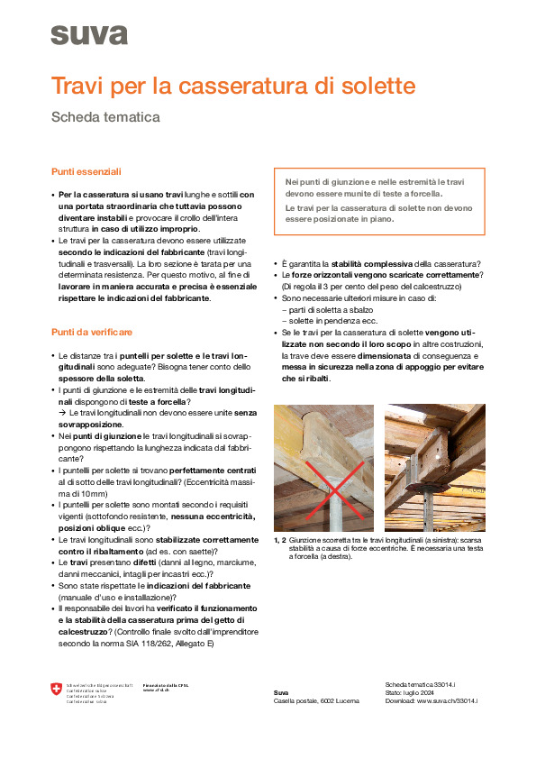 Il cedimento di un cassero per solette rappresenta un disastro per qualsiasi impresa edile, perché da un lato i collaboratori possono rimanere gravemente feriti o addirittura perdere la vita, e dall'altro il danno di immagine per l'azienda è enorme. In linea di massima, la stabilità di un cassero a travi per solette è garantita solo se le travi vengono utilizzate secondo le indicazioni del fabbricante, la ripartizione delle forze è corretta e i lavori vengono eseguiti a regola d'arte. Affinché possiate controllare l'utilizzo corretto delle travi sul vostro cantiere, vi forniamo a supporto una scheda tematica con i principali criteri di verifica, ovvero distanze, sovrapposizioni, fissaggio o anche le condizioni delle travi. Durante il montaggio di un cassero a travi si devono tassativamente osservare i punti seguenti: La scheda tematica contiene numerose figure, che mostrano l'aspetto di un cassero a travi per solette stabile e sicuro e quali installazioni non sono ammesse. Inoltre, sul foglio di due pagine è disponibile anche una tabella con le prescrizioni e norme rilevanti. Ulteriori informazioni sull'argomento sono disponibili nelle nostre due schede tematiche Puntelli per solette e Casseri per solette in strutture con soffitti alti.
