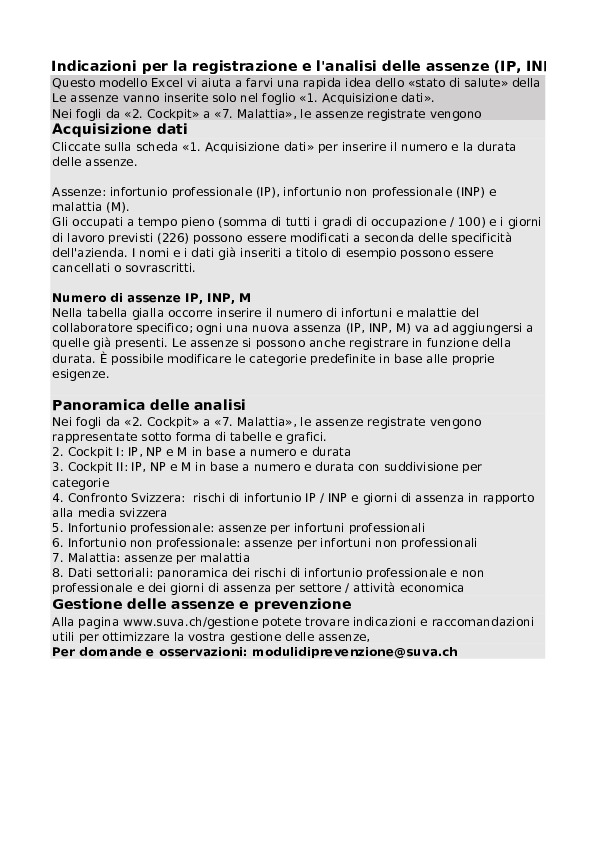 Nel nostro e-learning «Basi della prevenzione» apprenderà: Ogni azienda ha bisogno di personale produttivo e in buona salute.In media però ogni lavoratore si assenta 6,5 giorni l’anno. Questa situazione ha un costo elevato e crea disagio a tutte le persone coinvolte. Una gestione efficace delle assenze le consentirà di ridurre il numero di casi. Questo modello Excel le fornisce strumenti per verificare lo «stato di salute» della sua azienda. Registrando e valutando le assenze, si farà una buona idea della situazione. Prima di inserire i dati, deve aver rilevato sistematicamente le informazioni sulle assenze. Solo così potrà verificare come si posiziona la sua azienda in confronto ad altre imprese in Svizzera.