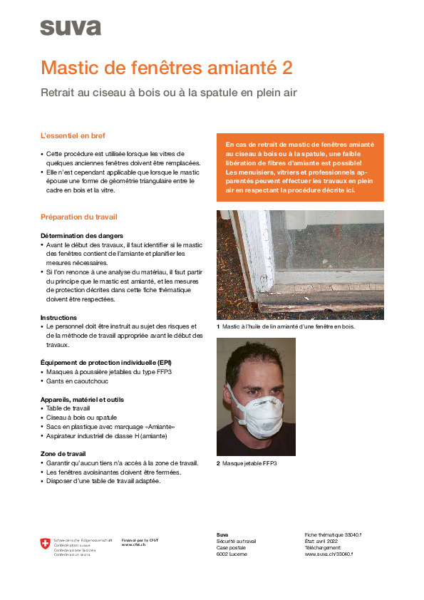 Dans de nombreux vieux bâtiments, le mastic de fenêtres contient de l’amiante. Lors du remplacement de vitres individuelles, vous pouvez retirer le mastic de fenêtres à l’aide d’un ciseau à bois ou d’une spatule. Toutefois, cette technique n’est possible qu’en plein air. Il faut s’attendre à une plus grande libération de fibres d’amiante, c’est pourquoi vous devez prendre le temps d’informer votre personnel et de lui fournir des équipements de protection individuelle. Après tout, il en va de la santé de vos travailleurs. Nous avons décrit dans cette fiche thématique le procédé exact, depuis la préparation du travail jusqu’à l’élimination correcte des déchets amiantés. Vous et vos travailleurs pourrez travailler efficacement et sereinement en respectant nos prescriptions. Vous trouverez plus d’informations sur le sujet dans la Fiche thématique 1 – Aperçu.