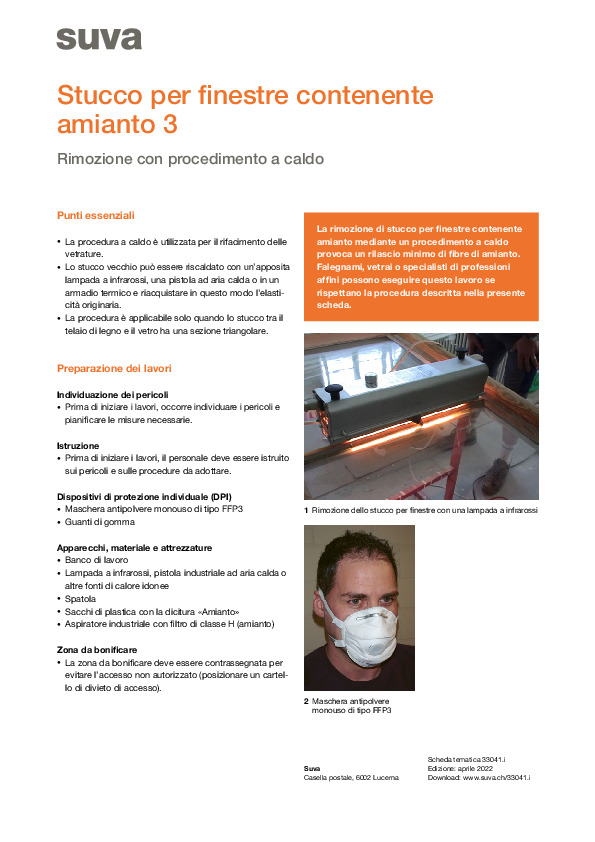 Molte finestre vecchie, oltre a essere antiquate dal punto di vista energetico, sono state installate con stucco contenente amianto. Per sostituire i vetri si è dimostrato valido il procedimento a caldo. Il materiale indurito ritrova la sua elasticità originaria e può essere rimosso facilmente. Ma anche con questo metodo possono essere rilasciate fibre di amianto. Per questo ai vostri collaboratori serve una formazione specifica, dispositivi di protezione individuale, un aspiratore industriale con filtro di classe H (amianto) e tutto il necessario per la pulizia e lo smaltimento corretti. Seguendo le prescrizioni di questa scheda tematica, nessuno inalerà la pericolosa polvere di amianto. Maggiori informazioni sul tema sono disponibili nella scheda tematica 1: In generale.